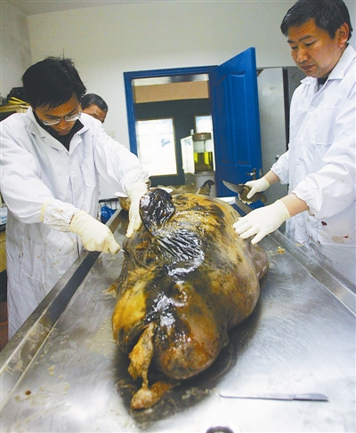 4月17日,专家在解剖死亡的江豚。近一个月来,洞庭湖连续发生江豚死亡事件,专家初步认为,航运业、渔业、气候变化、生态环境恶化是导致江豚死亡的主因。新华社发(高宝燕 摄)