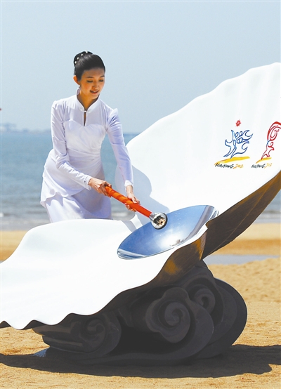 4月17日,采火使者在第三届亚洲沙滩运动会火种采集仪式上采火。