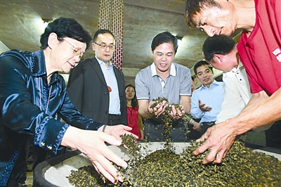在阿里山的制茶厂,代表团细细观看了阿里山高山茶制作的每一道工艺流程,在与茶厂经营者和工人的交谈中,了解茶叶产业的发展现状。