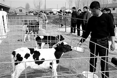 北旺乡天利和奶牛养殖场的工人正在给小牛犊喂代乳粉。梁宝忠 摄