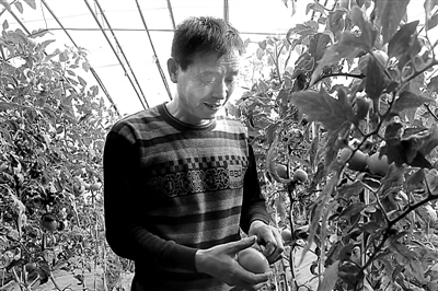 在自己的温室大棚里,王庆怀高兴地摘下一只熟透的番茄。梁宝忠 摄