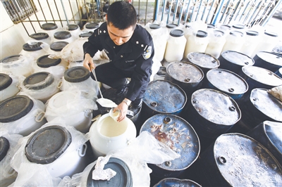 4月19日,图为浙江省台州市黄岩公安分局民警对查获的地沟油进行检查封存。当天,黄岩公安分局宣布摧毁一个横跨江苏、浙江和上海的新型“地沟油”产销网络。 潘侃俊 摄