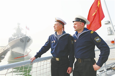 4月22日俄罗斯海军水兵参观中国军舰。新华社记者 查春明 摄