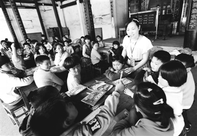 4月22日,青年志愿者、下各镇第二小学教师潘杭喜为黄梁陈村留守儿童教授《弟子规》。浙江仙居县下各镇黄梁陈村有个专门为留守儿童开办的“国学班”。每到星期日下午,当地近50名留守儿童和外来务工人员子女就聚到村里的明代祠堂内,由青年志愿者和退休教师轮流讲课,教授《弟子规》、《孝经》等内容。 新华社记者 韩传号 摄