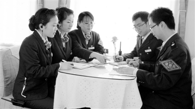 K1364次8组支部书记、列车长赵虹(左三)与班组成员围绕服务理念进行讨论。本报记者 徐福平 摄
