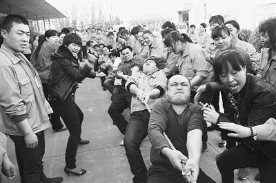4月23日,即发集团的外来务工人员在班后进行拔河比赛。山东青岛即发集团根据外来务工人员的特点和需求,开展各类体育健身、歌舞娱乐、学习培训等人文关怀活动,员工们在享受快乐的同时,也增进了彼此之间的感情。据了解,在集团2万职工中,一线工人90%是新生代外来务工人员,他们已成为企业发展的生力军。梁孝鹏 摄