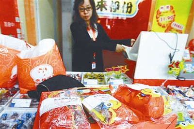 4月25日,针对媒体曝光部分杭州蜜饯生产企业涉嫌过量使用添加剂,并为来伊份、百味林等知名品牌代加工的情况,上海工商部门对全市连锁超市进行了检查,要求暂停销售并下架封存被曝光的“问题蜜饯”。截至当天16时,全市共下架蜜饯类食品7800余公斤。 新华社记者 裴鑫 摄