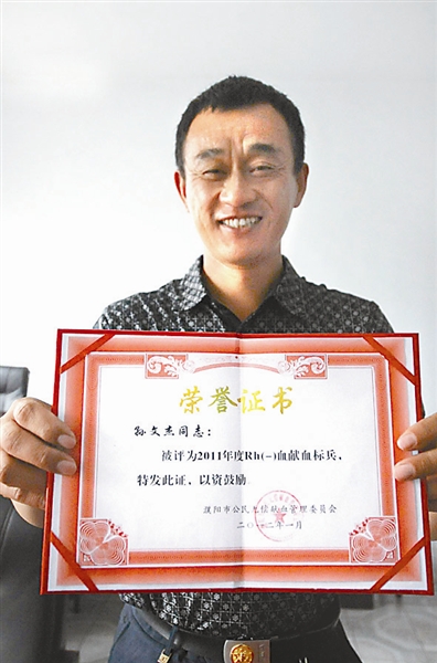 濮阳供电公司巡线工孙文杰被评为2011年RH(—)血献血标兵。43岁的他,偶然得知自己拥有被称为“熊猫血”的RH阴性AB型血后,12年中累计无偿献血5000余毫升。新华社记者 李安 摄
