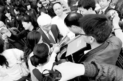 在第三届中国班组长论坛上,渴望在班组中成长的班组长们,在会议休息时把中国唯一的院士班组长余梦伦围个水泄不通,争着讨教成长之道,争着让他为自己的班组签名。 马俊 晓舟 摄