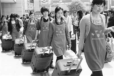 4月25日,湖北襄阳火车站,“襄阳月嫂”们排队进站赴深圳就业。由湖北省襄阳市总工会干部学校免费技能培训,并获得职业资质证书的首批近30名成绩优秀的月嫂、保育员、催乳师、育婴师等家政服务人员,集体乘车远赴深圳上岗。据了解,襄阳市总工会干部学校与深圳多家家政公司联姻,开展“月嫂应急培训”计划,全年将培训600名专业“襄阳月嫂”,分期分批送往深圳就业。龚波 摄