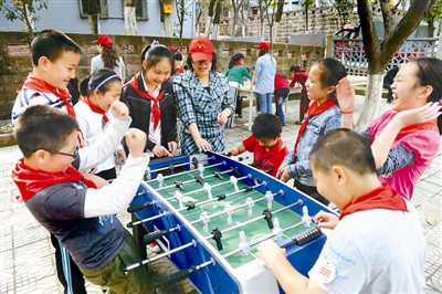 4月25日,同学们与志愿者一起在“四点半”学校玩游戏。