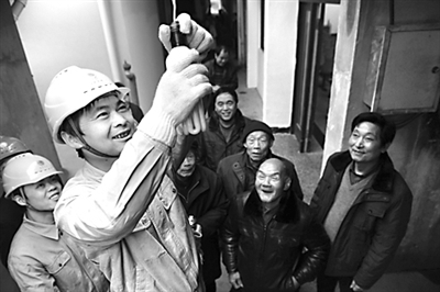 近日,余姚市供电局组织志愿者前往四明山区、丈亭、临山等地陆续开展奉献爱心活动。图为志愿者发现老人们经常进出的厕所走廊灯泡接线有问题,马上搬来梯子帮助维修好。(张娅玲 摄)