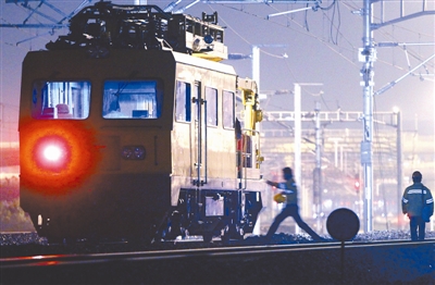 4月29日凌晨,高铁轨道线路巡检车沿途接送设备维护人员。