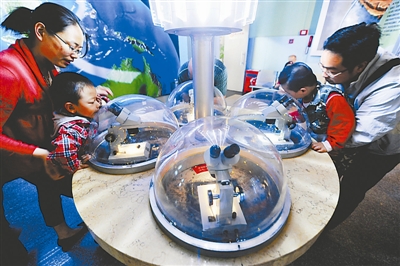 4月29日,家长带孩子在郑州市科技馆里参观。