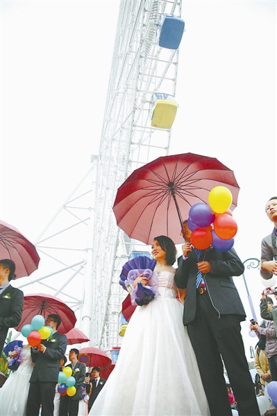 4月30日,新人们在南京弘阳广场116米高的摩天轮下参加集体婚礼。