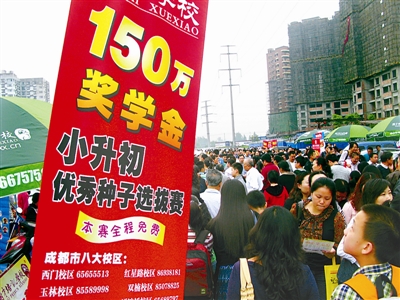 5月1日清晨7时许,成都外国语学校,前来参加小升初考试的家长和孩子摩肩接踵。由于报名参考近20000人,在成都外国语学校周边的公路两旁,接送学生的汽车延绵数公里之外。据初步估计,当天在成都外国语学校附近的人流达5万人左右。 钟敏 摄
