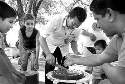 中铁四局一公司委内瑞拉北部平原铁路项目部,有大批外籍劳工与项目员工一道并肩施工。为了让外籍员工也感受到中国企业浓浓的关爱之情,项目部尽力满足他们工作、生活中的合理要求。图为外籍劳工阿杜鲁过生日,项目部给他送去了生日蛋糕和美好的祝福。郑连平 文良诚 摄