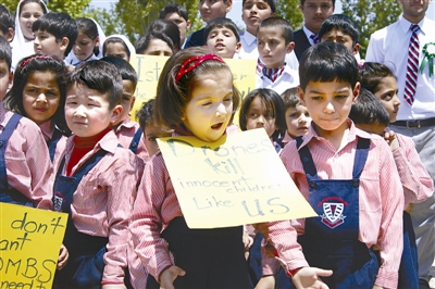 当地时间5月2日,巴基斯坦阿伯塔巴德,巴基斯坦儿童们在拉登被打死的地点,举着“不要杀害无辜儿童”之类的标语,抗议美军滥杀无辜。CFP供图