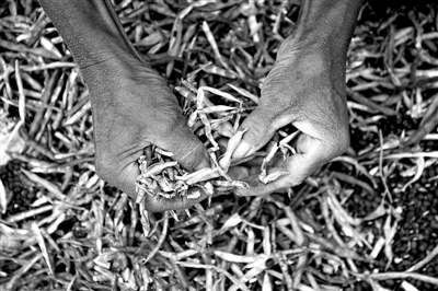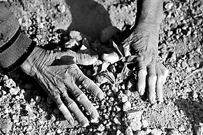 2011年9月2日,山西平陆陈张村,57岁的王更祥正在用手将晒干的红豆搓捻下来。这些红豆是在地角种下的,产量少,不值得上碾场,只好用双手搓捻。