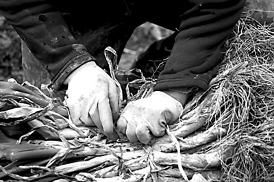 2011年11月26日,山西万荣泉沟村,58岁的李建义在农田里跪着将大葱绑扎成捆。当年的大葱为每斤0.2元左右,比上年的每斤0.7元低了两倍多。