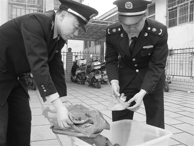 近日,江西赣州在菜市场发现人造猪耳朵,不仅有股难闻的化学品味道,而且没有血管、软骨,一撕就破。工商部门人员称,人造猪耳朵可能是用明胶和塑料做成的。图为赣州市章贡区沙河工商分局执法人员查获人造猪耳朵。新华社发