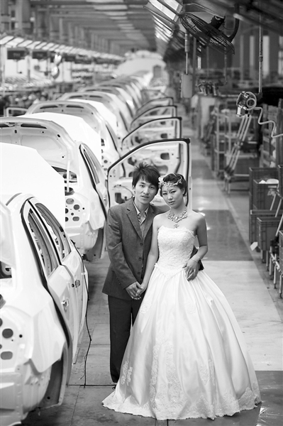 5月6日,浙江省台州市路桥区吉利集团的汽车生产流水线上,摄影师正在为一对新人拍摄婚纱照。当天,13对即将结婚的新人利用周末工厂停工的时间,选择在平常工作的地方拍摄婚纱照,留下他们爱的足迹。 潘侃俊 摄