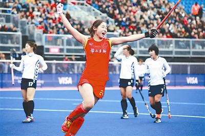 5月6日,中国队队员赵玉雕庆祝进球。当日,国际曲棍球邀请赛暨伦敦奥运会曲棍球测试赛在伦敦奥林匹克公园河岸竞技场落幕。在女子铜牌争夺战中,中国队以2比3不敌韩国队,名列第四。新华社发