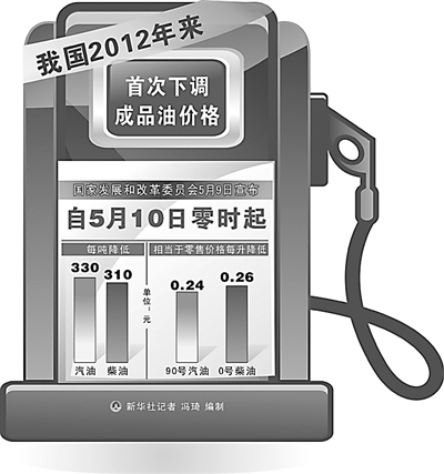 本报北京5月9日电(记者车辉)国家发改委今天宣布,自5月10日零时起,汽、柴油价格每吨分别降低330元和310元,测算到零售价格90号汽油和0号柴油(全国平均)每升分别降低0.24元和0.26元。这是国内成品油价今年以来首次下调。