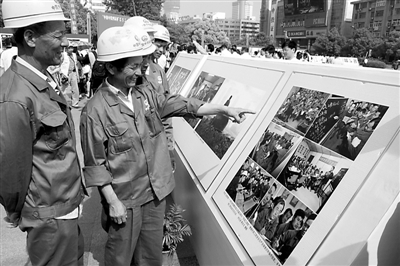 5月4日,全国首个“农民工”主题摄影大赛——“中国中铁四局杯农民工·我的兄弟姐妹”全国摄影大赛获奖作品展览在合肥市人民广场开幕。大赛自2011年8月份启动以来,共收到全国1000多位作者的近20000幅(组)作品。展出的获奖作品多角度、多层面地反映了农民工顽强拼搏的工作场景、艰苦简陋的生活环境、乐观向上的生活态度和勇于奉献的高尚品格。图为参加活动的农民工在作品中“寻找”自己的身影。舒郁仁 张红雷 摄