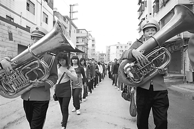 农民工司令请来乐队迎接新报到的工人,女工们低着头跟在乐手身后。当时,何苗苗也是在这样的场面下走进庞大的厂房。
