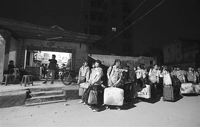 白天的报到结束了,夜色下,女工们提着沉重臃肿的行李包,等着分配宿舍。一天的奔波,已经让她们很疲惫了。
