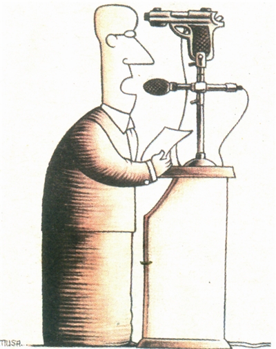 废话连篇的讲演者令人厌烦,主持人费尽心思欲让他们停下嘴来……漫画家更为开会“限时”出谋献策,但此画缺少人性化。
