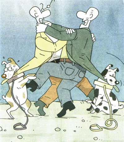 争强好胜的年轻人话不投机大动干戈,毫不退让。小狗上前拉架:劝君莫伤和气。此时此刻,狗的主人该当如何?