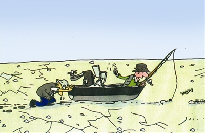 在干涸的河床上,钓鱼者如获至宝地发现了“目标”,顿时激发起新的动力。作者的构思画水不见水,高!