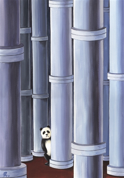 竹林,是大熊猫的理想“户口所在地”。有鉴于这个基本生态常识,画家笔下的大熊猫多以竹林为背景,吝啬一些的,也要画上几片竹叶,以示对国宝的关爱。毕力格先生在这个问题上做了一点“手脚”,他“别有用心”地用整齐有序的金属管道,为国宝们的家园做了一次改造。可以说,漫画家用工业化手段对工业化本身提出了质疑。