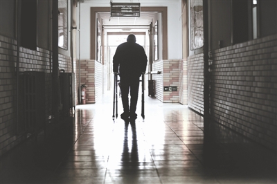 3月22日,北京,大兴泰富春老年公寓。一位腿脚不好的老人推着自己的轮椅在走廊里行走。很多养老院里,护工短缺和医疗缺位,把很多老人从对养老院专业、温馨的想象拉回到了现实。尹亚飞 摄