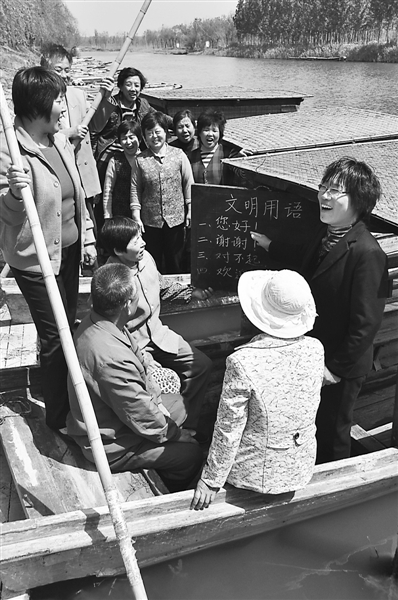 为提高船工素质,提升景区服务水平,近日,山东省桓台县对马踏湖景区职业船工进行文明用语培训,该景区每年接待游客30多万人。