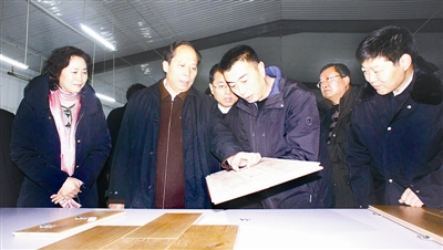 中国龙江森林工业(集团)总公司党委书记高金芳(左一)、总经理魏殿生(右一)陪同省委主要领导视察林产工业厂家