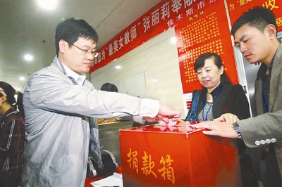5月16日,黑龙江哈尔滨,市民为“最美教师”张丽莉捐款,让爱心传承。当日,哈尔滨医大医院二号楼大厅内为张丽莉设置的捐款箱迎来了许多奉献爱心的市民,放进捐款箱的钱不管多少,都代表着一份真挚爱心。 肖刚 摄