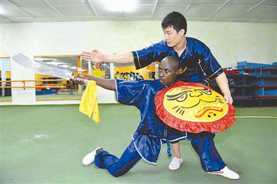 5月14日,在科特迪瓦经济首都阿比让,武术教练陈帅(上)指导学员练习武术。创建于2009年的科特迪瓦中华武馆以“弘扬中华武术,增进中科友谊”为宗旨,吸引了近百名来自科特迪瓦、黎巴嫩、法国、韩国、摩洛哥的学员在武馆学习中华武术。