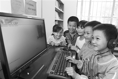 5月17日,在宜黄县梨溪镇外阴村的“牵手连心”亲情驿站里,村小学三年级的余海峰(右一)、余海洋(右二)双胞胎等留守儿童与在福建打工的父母视频聊天。