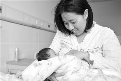 5月17日,在陕西省府谷县医院妇产科,一名妇女抱着自己出生不久的孩子。
