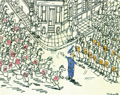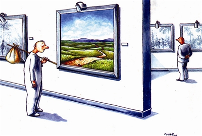 环境污染日趋严重,森林绿地已成稀罕景色。这位来自荒漠的先生在画展上看到如此“风光”,感慨万千,无限向往……