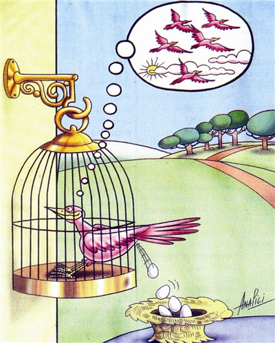 受困牢笼的鸟儿朝思暮想自由和蓝天。无奈中,只能把希望寄托在下一代身上了。可怜天下父母心啊!
