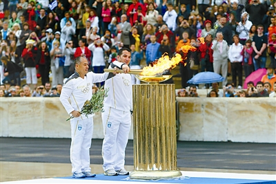 当地时间5月17日,伦敦奥运会火炬交接仪式在雅典举行,李宁(左)点燃圣火盆。CFP供图