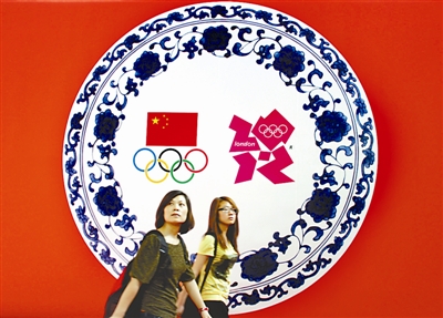 北京:奥运气氛日浓。图为5月17日两名观众在中国国际体育用品博览会中国奥委会展台前走过。CFP供图