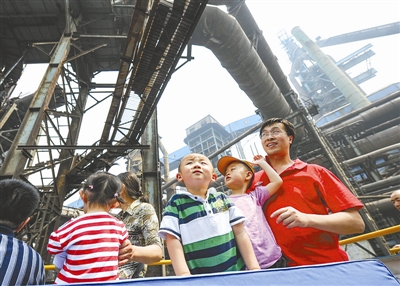 5月19日,游客乘坐《先行号》观光火车游览首钢石景山主厂区。当日,于2010年底全面停产的首钢石景山主厂区大型工业遗迹首次对游人开放。此次开放了主厂区一百多公里铁道线路的一部分,游客可以乘小火车穿行在厂区,领略其磅礴气势。 新华社记者 罗晓光摄