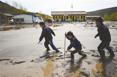 5月14日,岷县瓦结小学的孩子们从满是泥泞的学校前走过。 岩石 摄