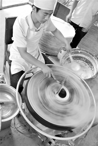 今年27岁的小伙杨玉龙是山东省新泰人,2009年从洛阳师范学院毕业后换了几个工作,但一直不如意。偶然的机会,杨玉龙发现纯手工煎饼的市场不小,萌发了自主创业的想法。经过3个多月的努力,一辆三轮车、一块写着“本科生煎饼”的招牌、憨厚的笑容和实在的生意,让杨玉龙逐渐赢得了客户的认可。图为杨玉龙在家中制作手工煎饼。 新华社记者 徐速绘 摄