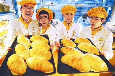5月20日,智障青少年在向顾客介绍刚出烤箱的面包。当日是第22个“全国助残日”,一家由智障青少年主理的面包坊在南京闹市区的华侨路开张营业。该面包坊由民间公益组织爱德基金会创办和管理,店里8名智障青少年由基金会面向社会招募,并进行培训后上岗营业。 王新 摄